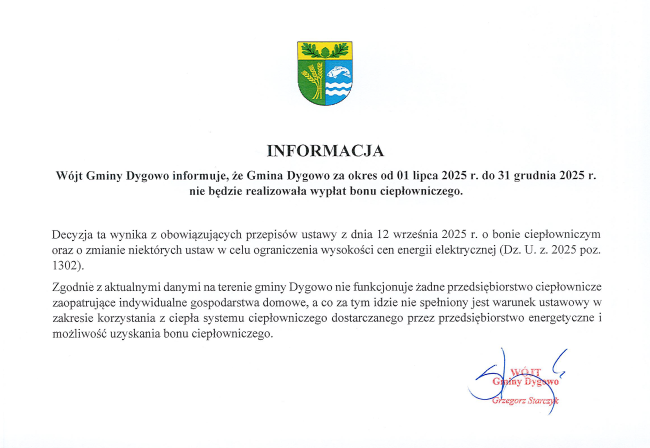 Informacja Wójta Gminy w sprawie Bonu Ciepłowniczego